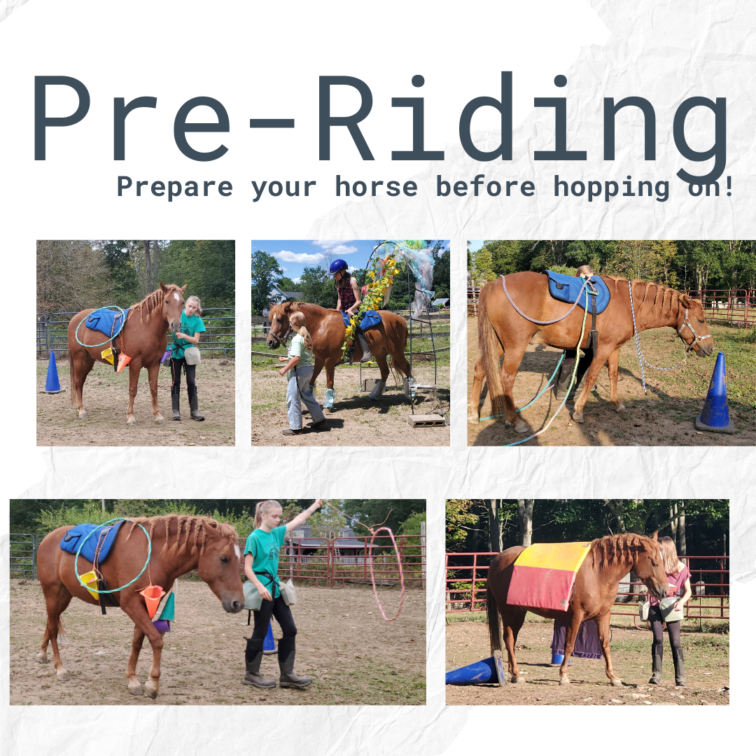 Next we need to assess the emotions. Are they emotionally prepared for this skill? Is a Whole ~100lb, upright human, that moves around, makes noises, and is highly stimulating the first full object your horse has ever been asked to carry? Maybe start with some smaller steps. Can they carry a pair of sweatpants that have been stuffed? How about some pool noodles sticking all around them? How about if something is dragging/dangling from their body? How about noise makers? What if it's uncomfortable or unbalanced? What if it falls off the side?